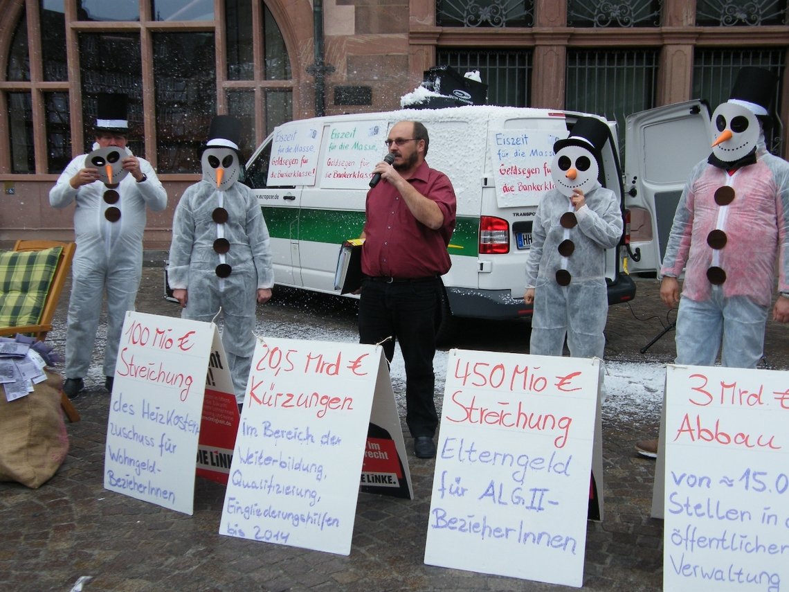 Der Reiche sitzt auf einem Sack voll Geld, die Schneemänner und die Schneekanone verbreiten eine Eiseskälte – so machte die Fraktion DIE LINKE. im Römer gestern auf dem Römerberg auf die Politik der sozialen Kälte lautstark aufmerksam. „Eiszeit für die Masse – Geldsegen für die Bankerklasse“ war das Motto. Fünf Euro mehr für Hartz IV-Bezieher, während Banker wieder Millionen Boni einstreichen – eine nicht hinnehmbare Politik, welche die soziale Schieflage der Gesellschaft zementiert.